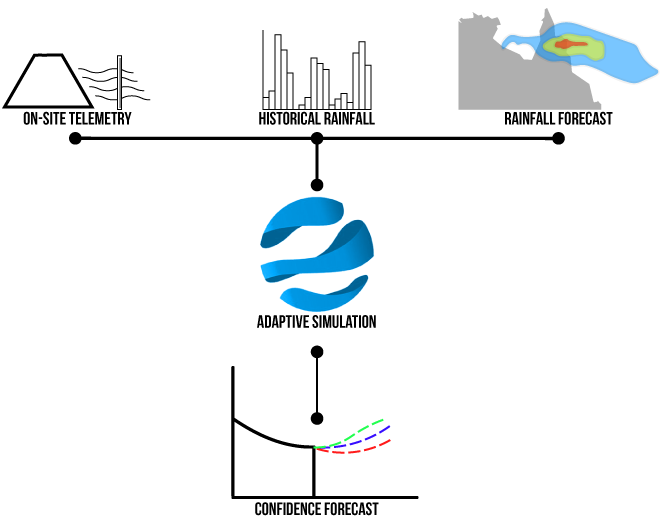 OPSIM RT can perform Adaptive Real-time Simulations (ARTS), where is where it produces a simulation based on the Bureau of Meteorology information. OPSIM can performs these simulations continuously as new Bureau information is published, providing the most up to date forecast of system behaviour. OPSIM can give early warning of possible release windows, giving enough time to mobilise a response and prime the pumps. Improved release response translates directly to reduced storage demand. At the other end of the scale OPSIM can also provide early warning for possible overtopping in the event of extreme weather. Again in this situation the early warning allows the mobilisation of response teams to mitigate the event.